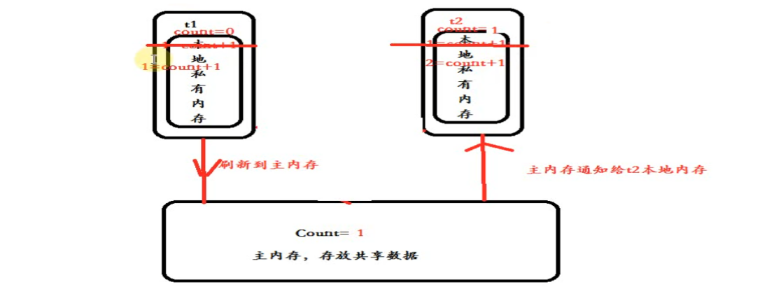 JAVA内存模型(JMM):JVM为了提高程序的执行效率,会对我们的程序进行优化,把经常需要被访问的变量存储在我们的缓存当中,也就是CPU中的寄存器(Cache)里,而避免直接去内存里读。多线程操作数据时,分为主内存和私有内存,如下图