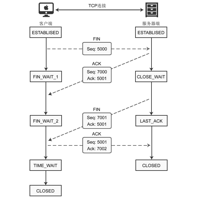 ​ 4、第四次挥手:客户端收到FIN后,返回ACK报文确定,服务端进入CLOSED状态,完成四次握手。