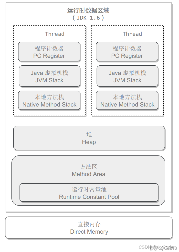 JVM的内存结构大致分为五个部分,分别是程序计数器、虚拟机栈、本地方法栈、堆和方法区。除此之外,还有由堆中引用的JVM外的直接内存。