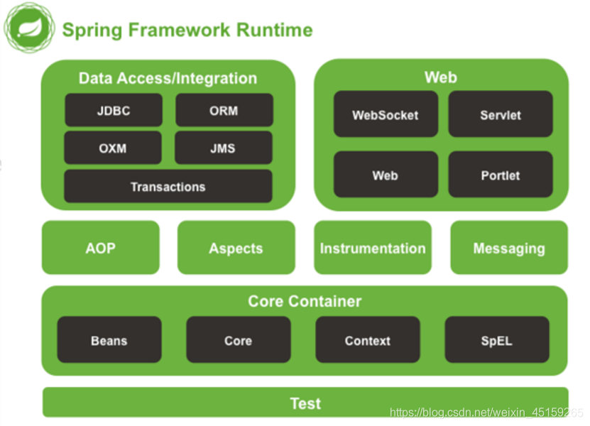 ​ Spring 由 20 多个模块组成,它们可以分为数据访问/集成(Data Access/Integration)、 Web、面向切面编程(AOP, Aspects)、提供JVM的代理 (Instrumentation)、消息发送(Messaging)、 核心容器(Core Container)和测试(Test)。