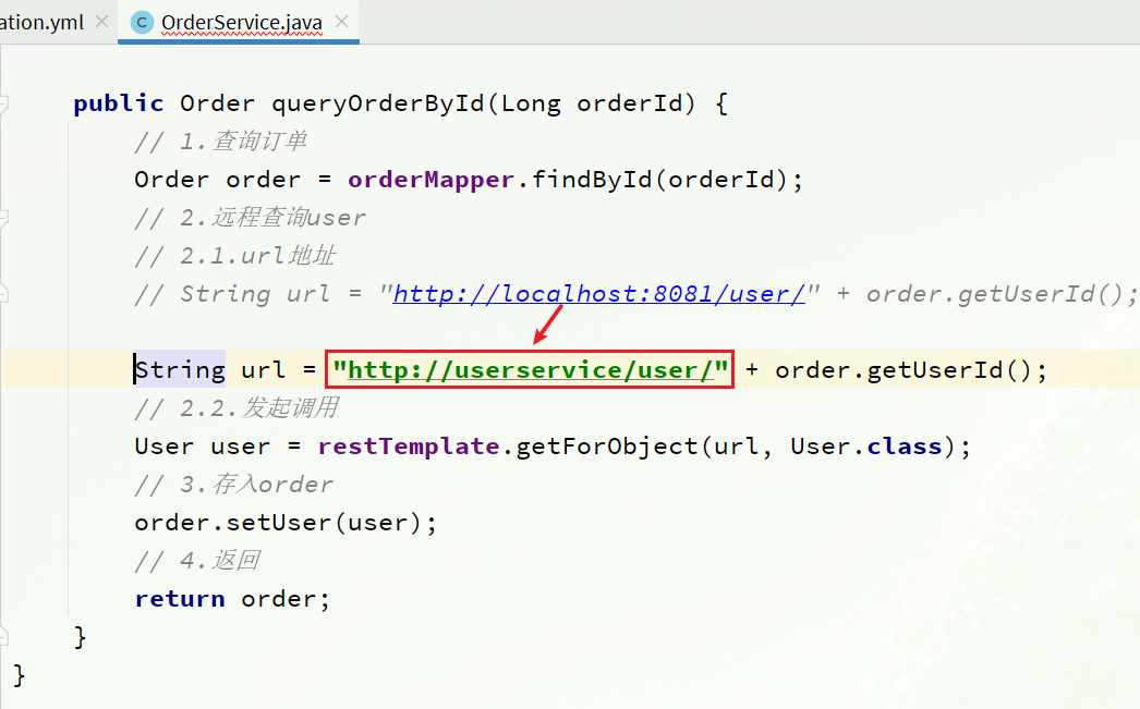 - 修改order-service服务中的OrderService类中的queryOrderById方法,根据Order对象中的userId查询User