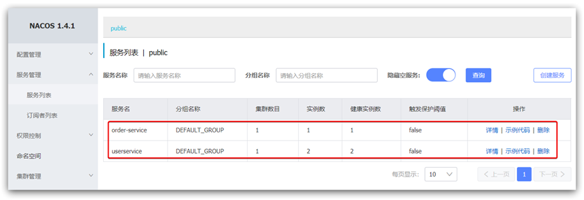 重启微服务后,登录nacos管理页面,可以看到微服务信息: