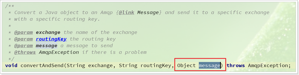 1 2 3 4 5 6 7 8 9 @Test public void testSendMap() throws InterruptedException { // 准备消息 Map<String,Object> msg = new HashMap<>(); msg.put("name", "Jack"); msg.put("age", 21); // 发送消息 rabbitTemplate.convertAndSend("simple.queue","", msg); }