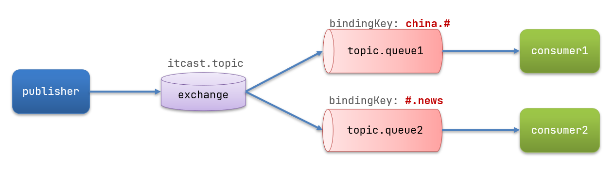 1 2 3 4 5 6 7 8 9 10 11 12 13 14 15 16 17 @RabbitListener(bindings = @QueueBinding( value = @Queue(name = "topic.queue1"), exchange = @Exchange(name = "itcast.topic", type = ExchangeTypes.TOPIC), key = "china.#" )) public void listenTopicQueue1(String msg){ System.out.println("消费者接收到topic.queue1的消息:【" + msg + "】"); } @RabbitListener(bindings = @QueueBinding( value = @Queue(name = "topic.queue2"), exchange = @Exchange(name = "itcast.topic", type = ExchangeTypes.TOPIC), key = "#.news" )) public void listenTopicQueue2(String msg){ System.out.println("消费者接收到topic.queue2的消息:【" + msg + "】"); }